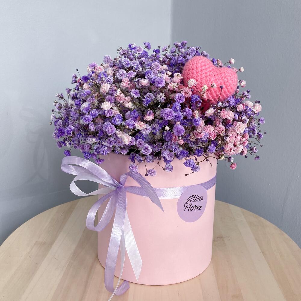 гипсофила крашенная – 7 шт.топпер вязанный «сердце» – 1 шт.Шляпная коробка – 1 шт.