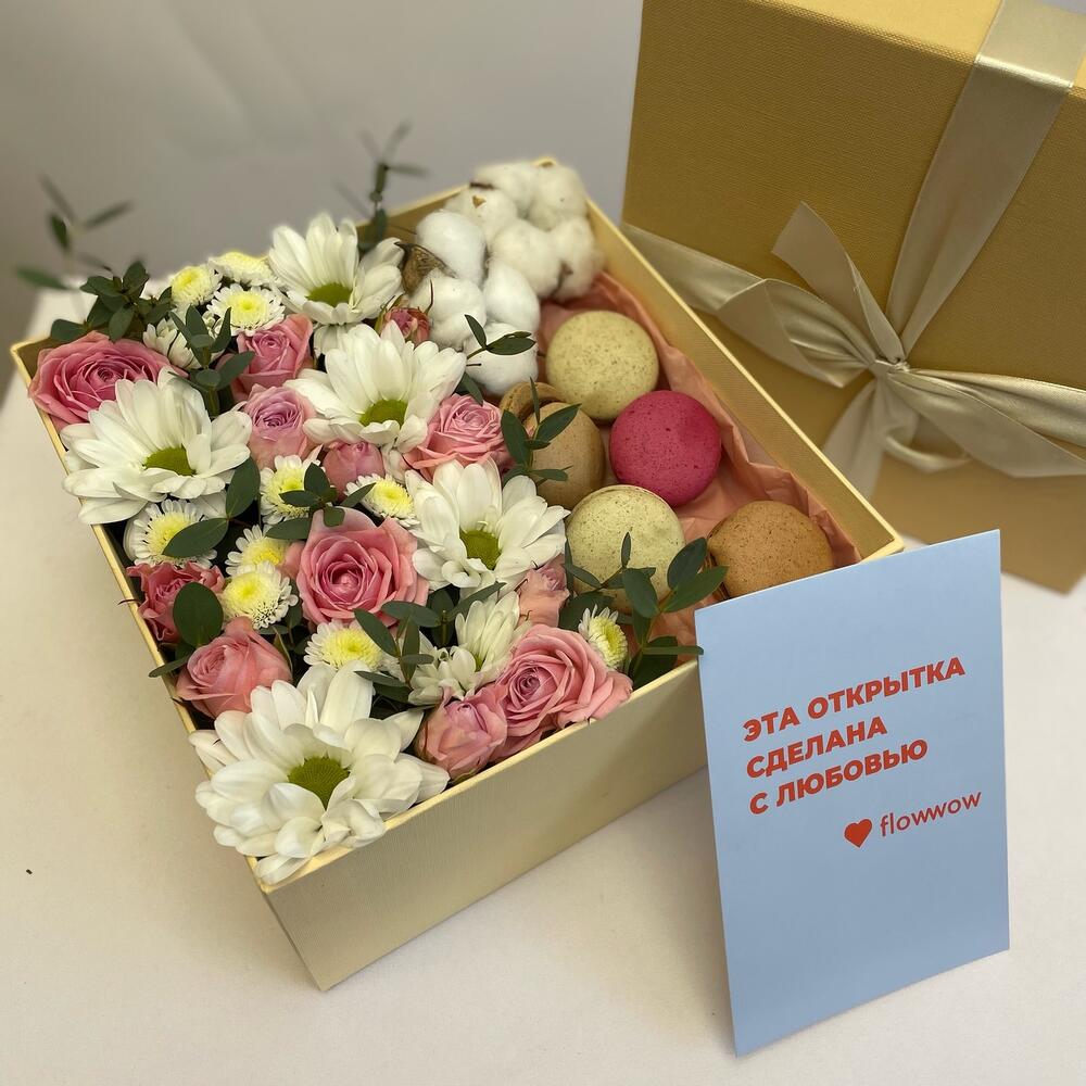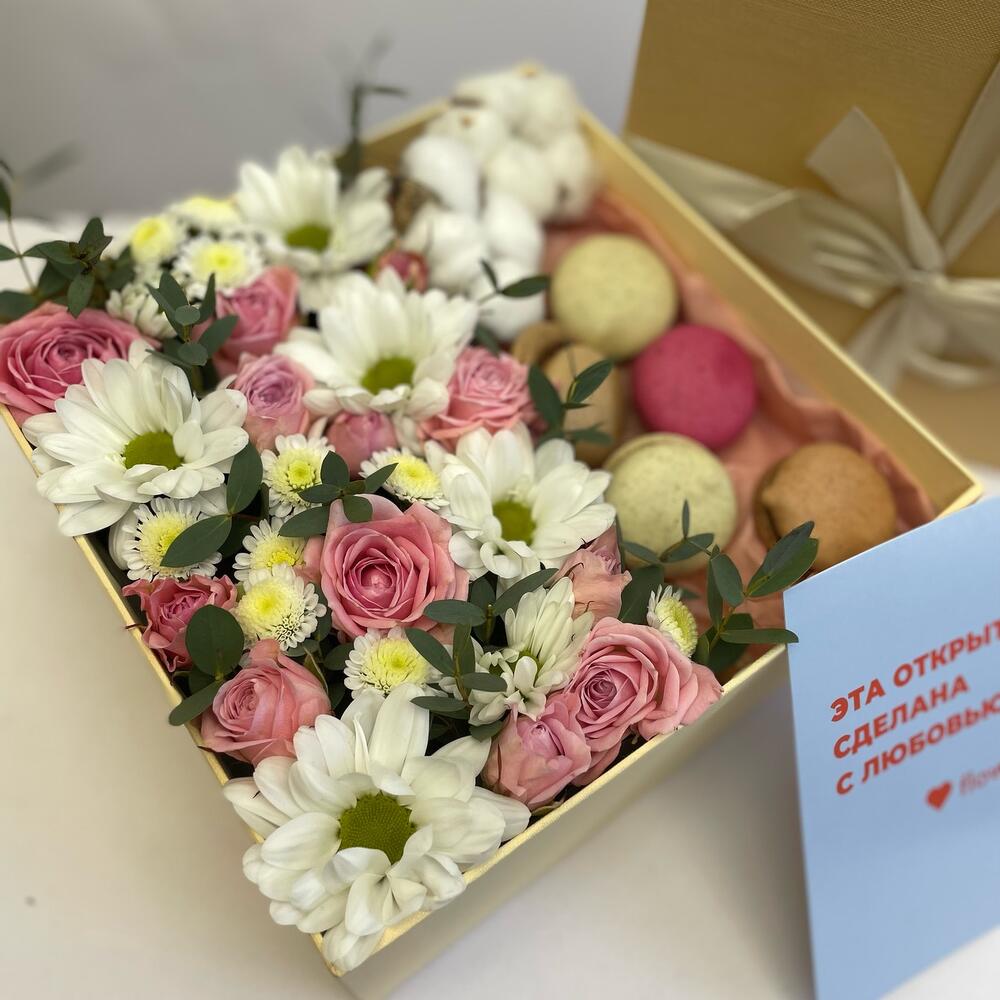 Кустовая роза – 5 шт.Коробка подарочная – 1 шт.Фисташка – 1 шт.Хлопок натуральный – 2 шт.эустома белая – 3 шт.Макарон – 6 шт.Губка флористическая – 1 шт.