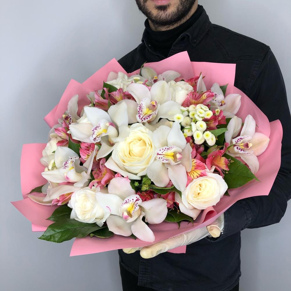 Орхидея Цимбидиум – 11 шт.Альстромерия – 7 шт.Роза – 7 шт.Хризантема кустовая – 3 шт.Зелень – 15 шт.Упаковка – 1 шт.